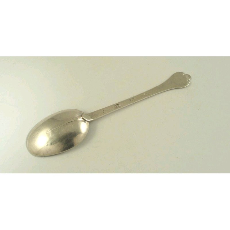 A James II trefid spoon, scratched 'MF' on the back of the terminal, makers mark worn, possibly by Lawrence Coles, London 1688. 7.25in (18.5cm) long. 1oz