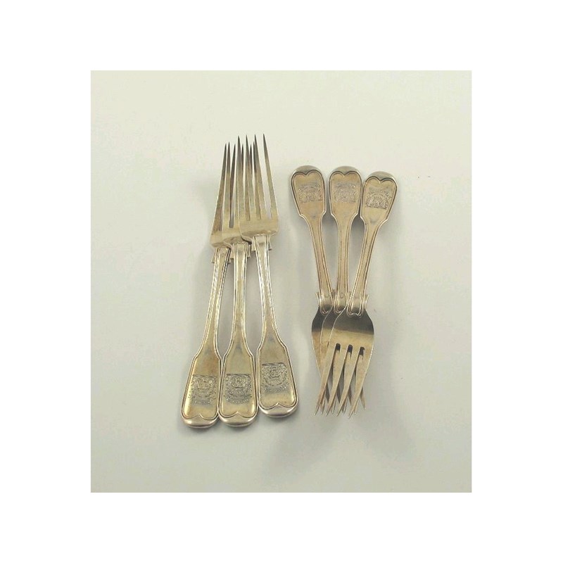 A set of six Victorian silvergilt tableforks, fiddle and thread pattern, crested*, by Elizabeth Eaton, London, 1857, 16.5oz (6).