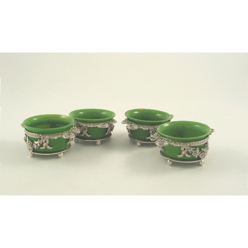 A set of four Edwardian open-work salts, with ribbon and rosette handles and opaque, lime green glass liners by Robert and Belk, Sheffield 1906, 3.75in (9.5cm) wide overall, 4oz weighable silver. (4)