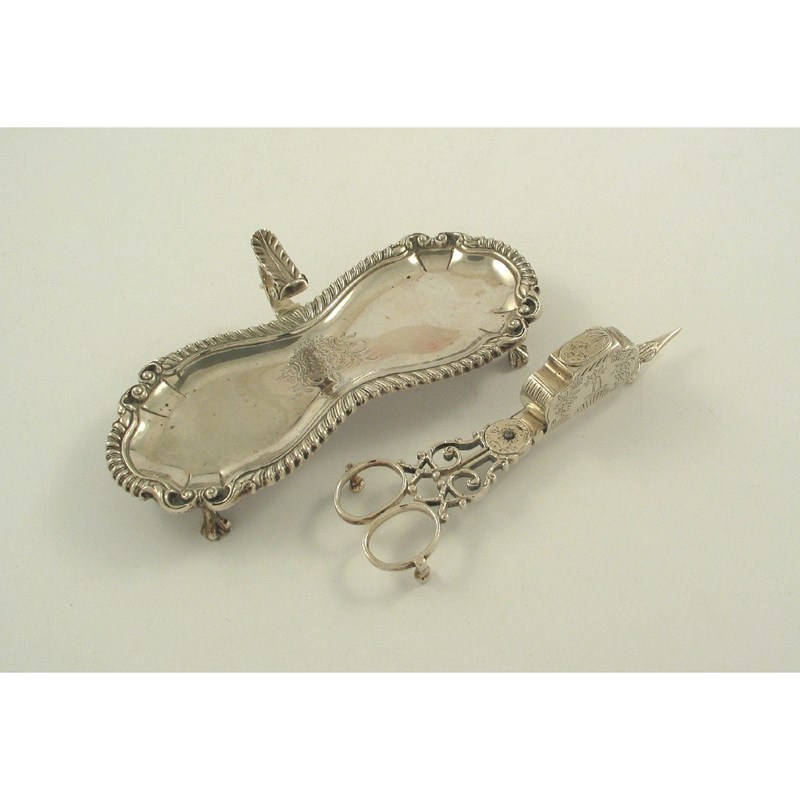 A George III waisted snuffer tray, with a flying scroll handle ball and claw feet and a gadroon and scroll border engraved armorial and crest, together with a pair of decorative scissors snuffers, crested to maker. The stand by William Caf London 1764, the snuffers by J.Booth, London 1763, 7.5in (19cm) wide overall, 11oz. (2)