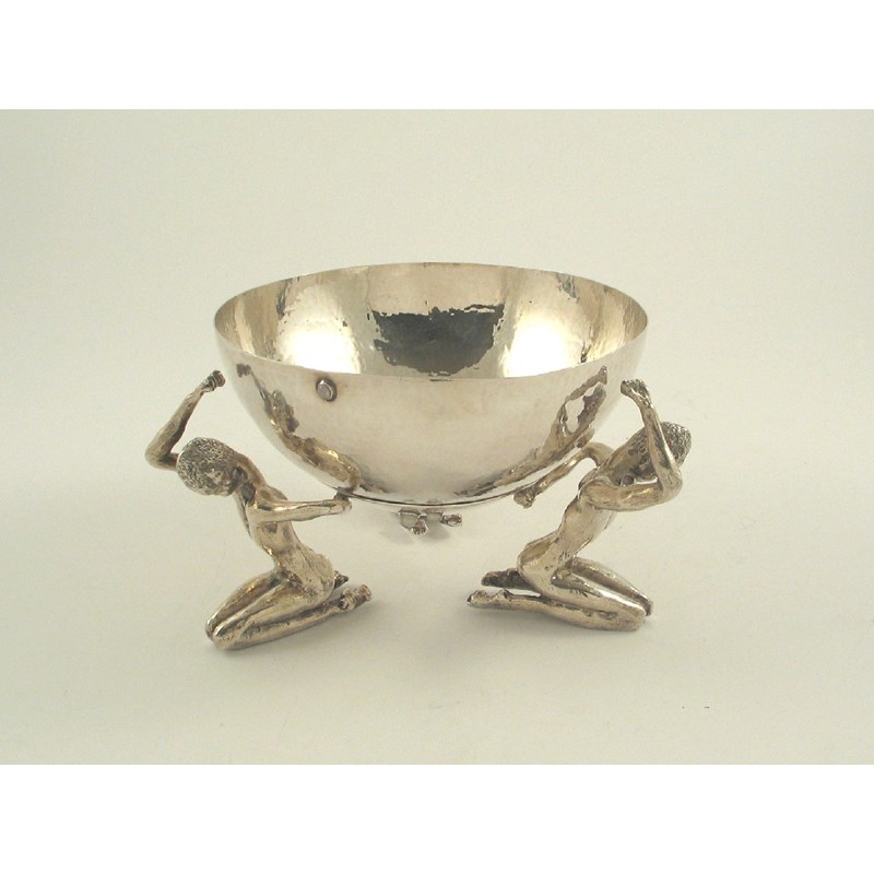 A modern handmade table centrepiece, in the form of a stand on three cast, kneeling, elfin figure supports, with a lift-off hemispherical bowl, labachon-set with a few random moonstones, maker 'ALTD', Birmingham 1977, 6in (15.3cm) diameter, 35oz.