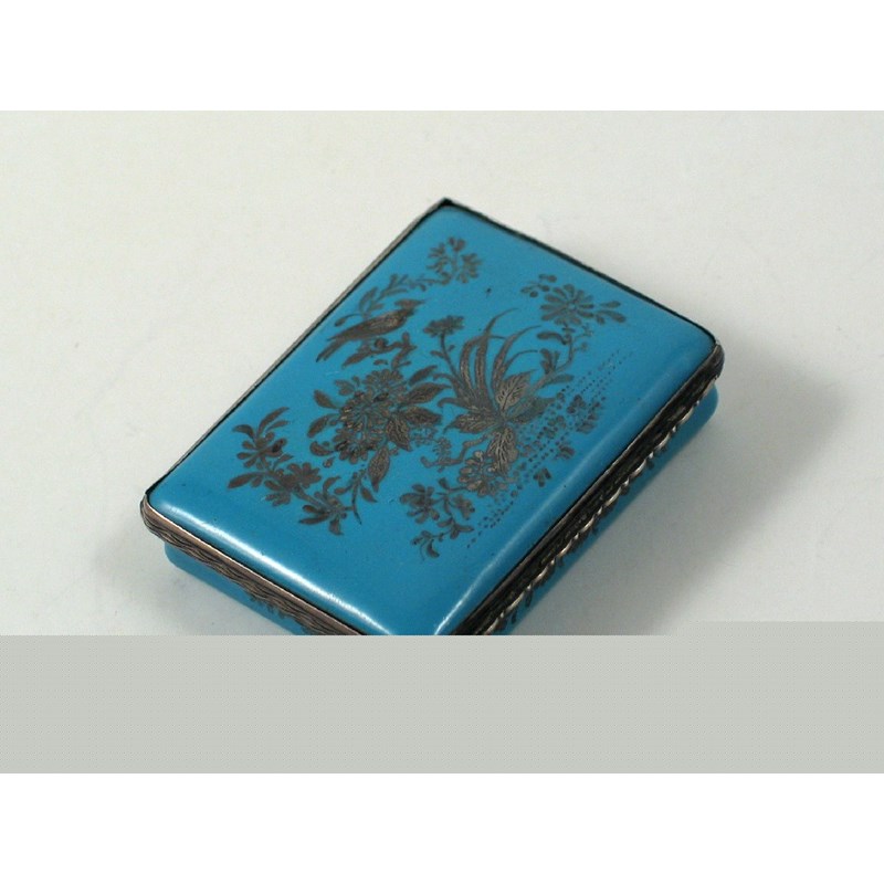 A late 18th century French mounted enamelled copper powder box, with a pastel blue cover and base decorated with silver inlay, the interior with a mirror and the inscription "Marque de mon estime", unmarked, circa 1716.