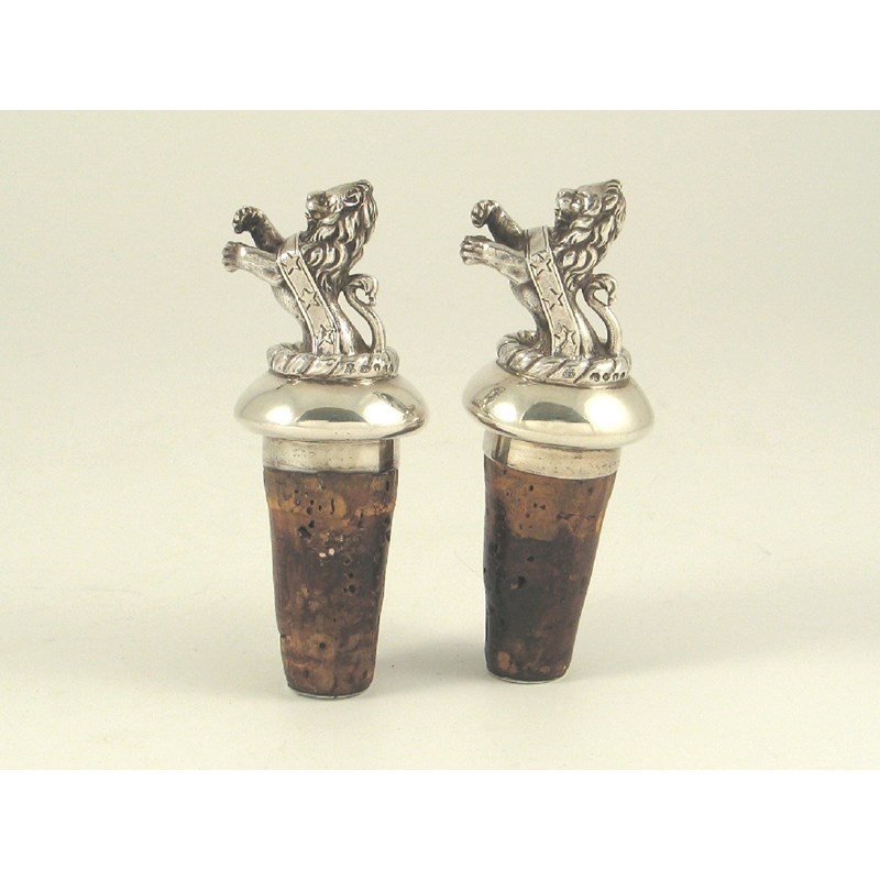 A pair of Victorian heraldric mounted bottle corks, in the form of a demi lion rampart with a sash, by Robert Garrard, London 1850, 4in (10cm)high. (2)