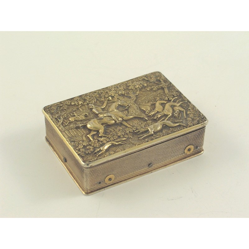 A George III silvergilt musical snuff box, of rounded oblong form, with engine turned base and sides, the cover decorated in high relief with fox hunting scene, no apparent makers mark, London 1819 (contained in fitted leather case with winding key), 3.9in x 2.75in (10cm x 7cm).