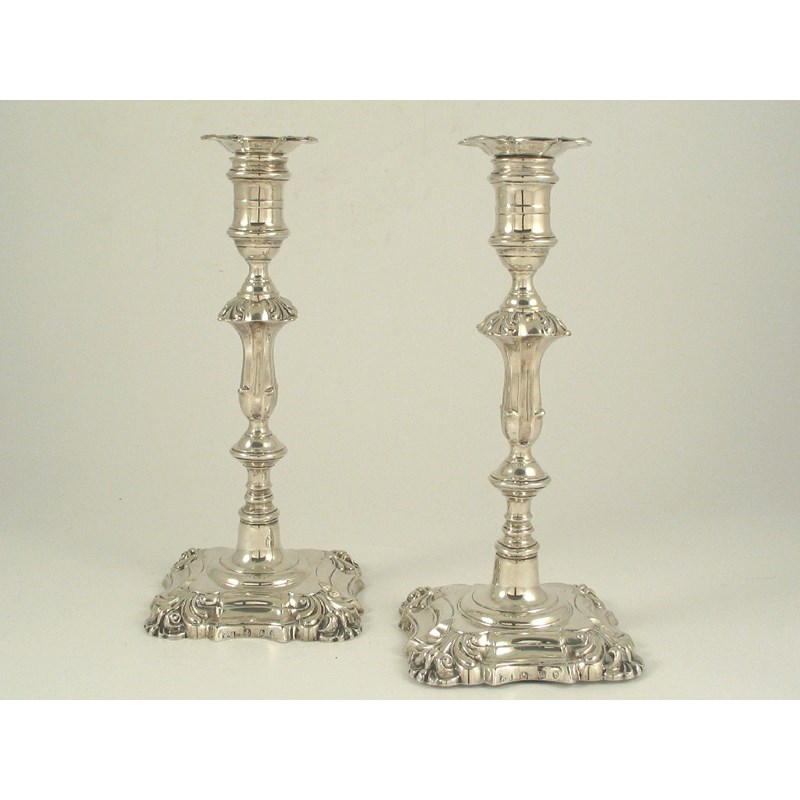 A pair of Edwardian Scottish candlesticks, on sloped square bases, with spool shaped capitals and shell decoration at the corners by Hamilton and Inches, Edinburgh 1901, 9.5in (24cm)high. (2)