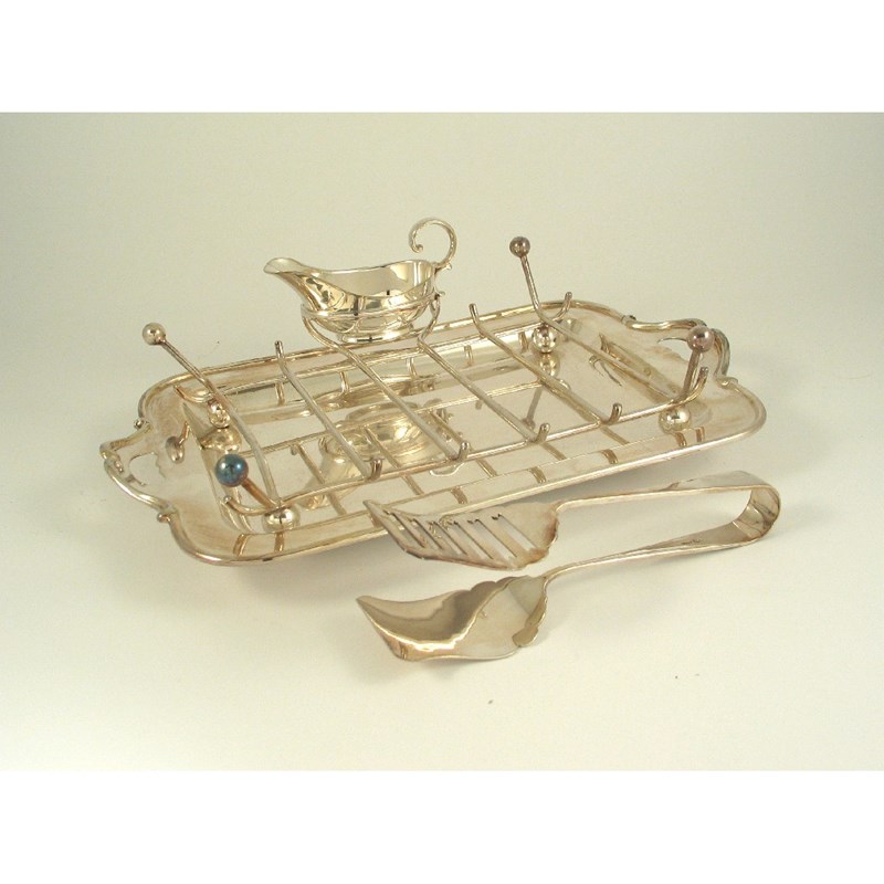 A plated asparagus set comprising: tray, grille, serving tongs and sauce/butter boat. 13.5in (34cm)wide overall.