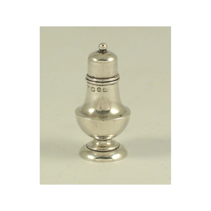 A late Victorian spice or condiment container, in the form of a small vase, with a pull-off, domed cover incorporating a small gilt spoon, makers mark worn, Birmingham 1892/94, 2in (5cm)high.