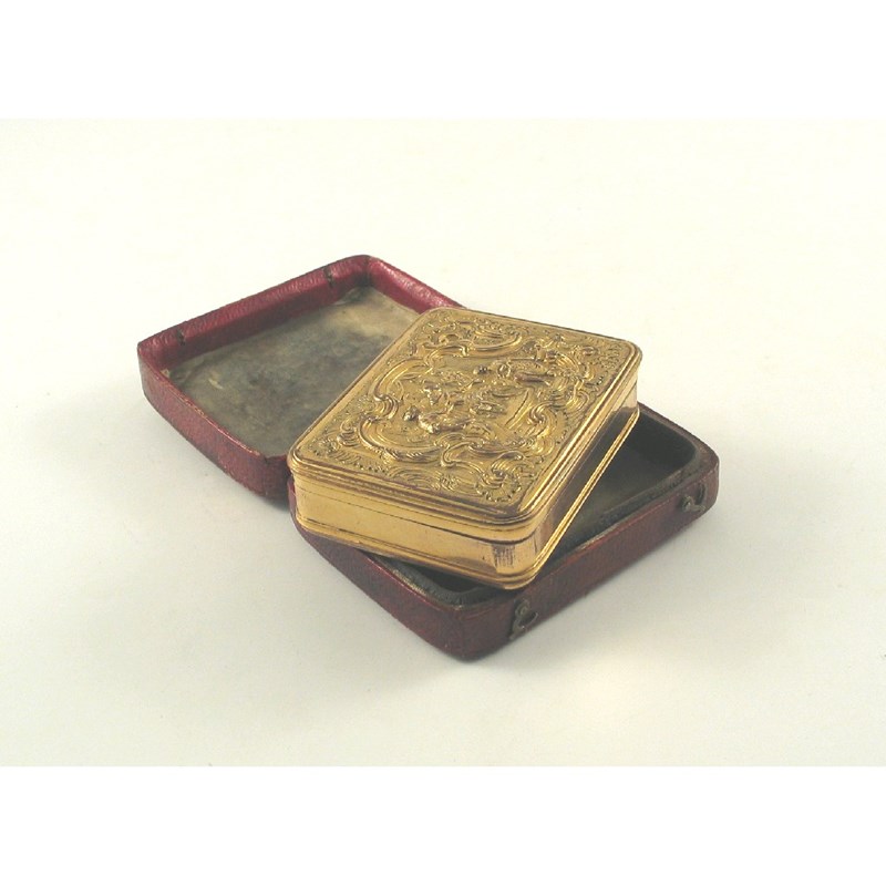 An early 19th century gilt metal oblong snuff box, with rounded corners, the cover with an inset plaque depicting a figural scene with a subject kneeling before the emperor, in relief within a scroll cartouche, c.1810 (in original fitted Morocco leather case) 3.3in (8.5cm) wide.