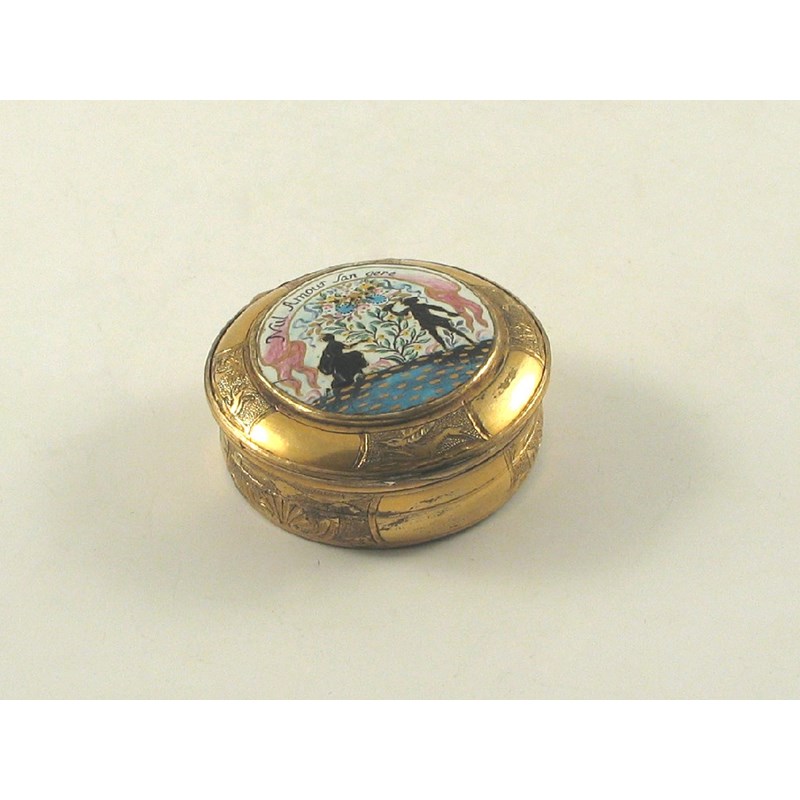 A mid 18th century gilt metal circular snuff box with a tortoiseshell base, chased reserves of flora and fauna, the cover inset with a Berlin enamel plaque titled 'Nul Amour San Gere,' with encrustations, unmarked c.1740. 2.5in (6.5cm) diameter.