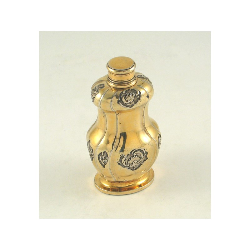 An early 20th century Danish silver gilt toilet flask, decorated with chased reserves and an applied cipher, screw cover, by DC.F. Halsberg (retailed by Michelson) Copenhagen 1908, 4.9in (12.5cm) high. 5oz