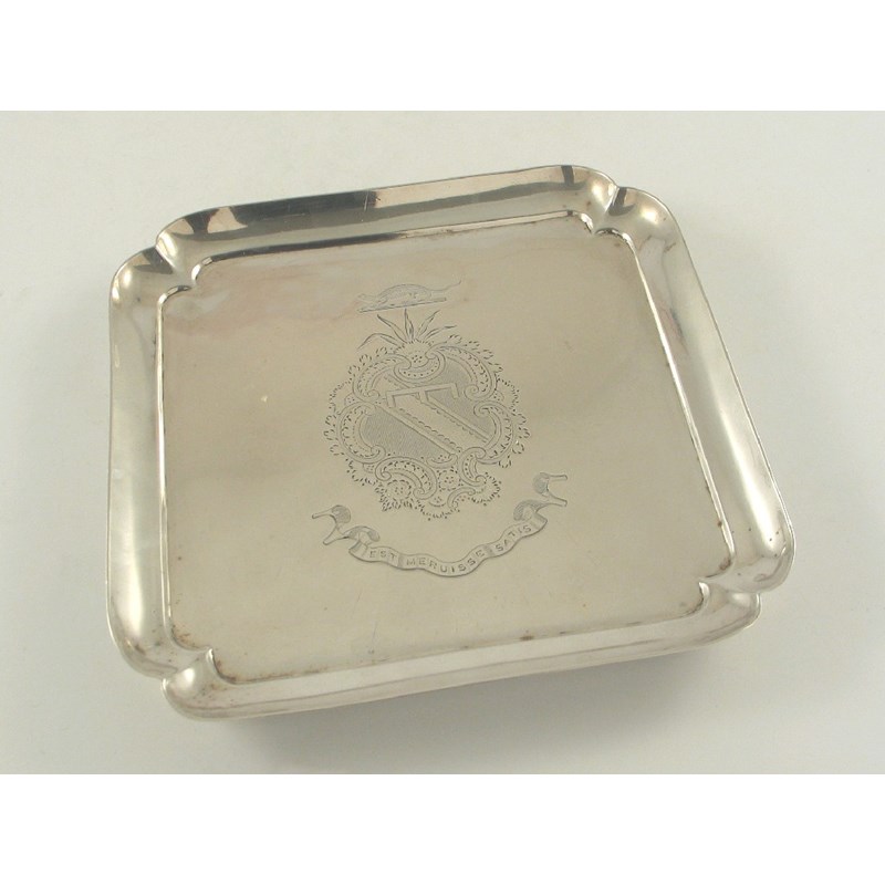 A late Victorian square salver, with incurved corners and bracket feet, engraved coat of arms, crest and motto 'EST MERUISSE SATIS,' by Charles Boyton, London 1890. 7.25in (18.2cm) 11oz