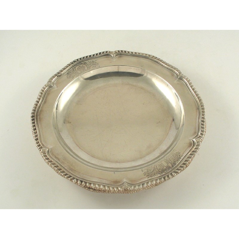 A set of four George III second course dishes, of shaped circular outline with a gadrooned border, engraved with a coat of arms and a crest, by Sebastian & James Crespell, London 1770. 10.75in (27.5cm) diameter. (4)