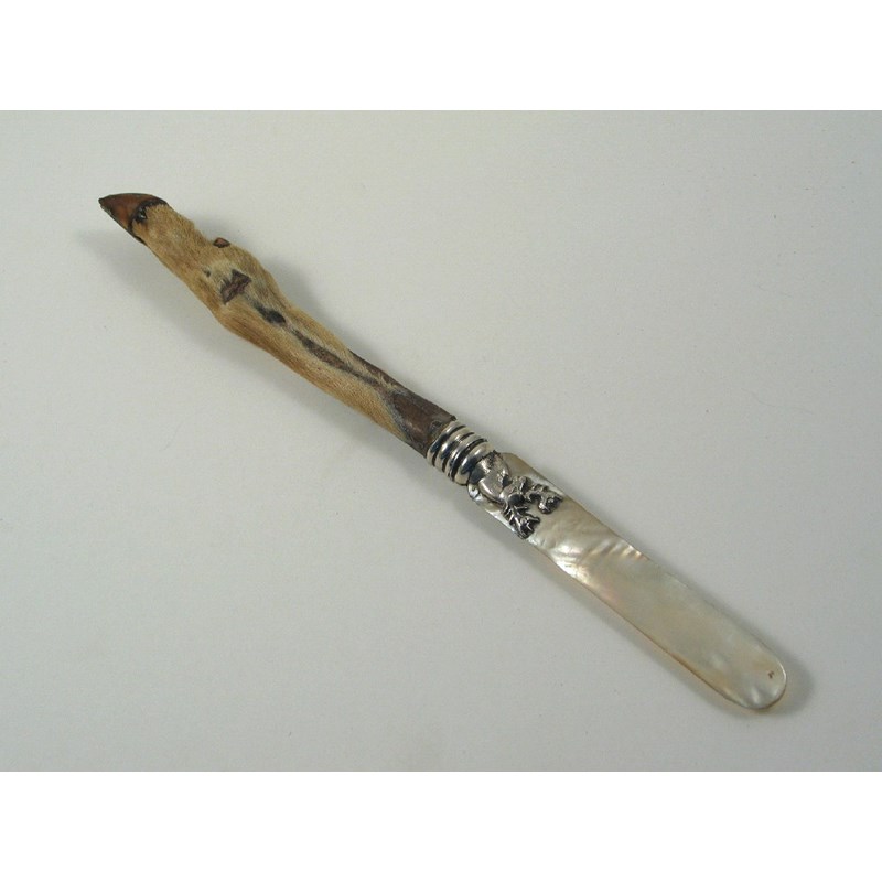 A mounted mother of pearl paper knife, with a hinds foot handle and an embossed stags head junction, unmarked, c.1900, 11in (28cm)long.