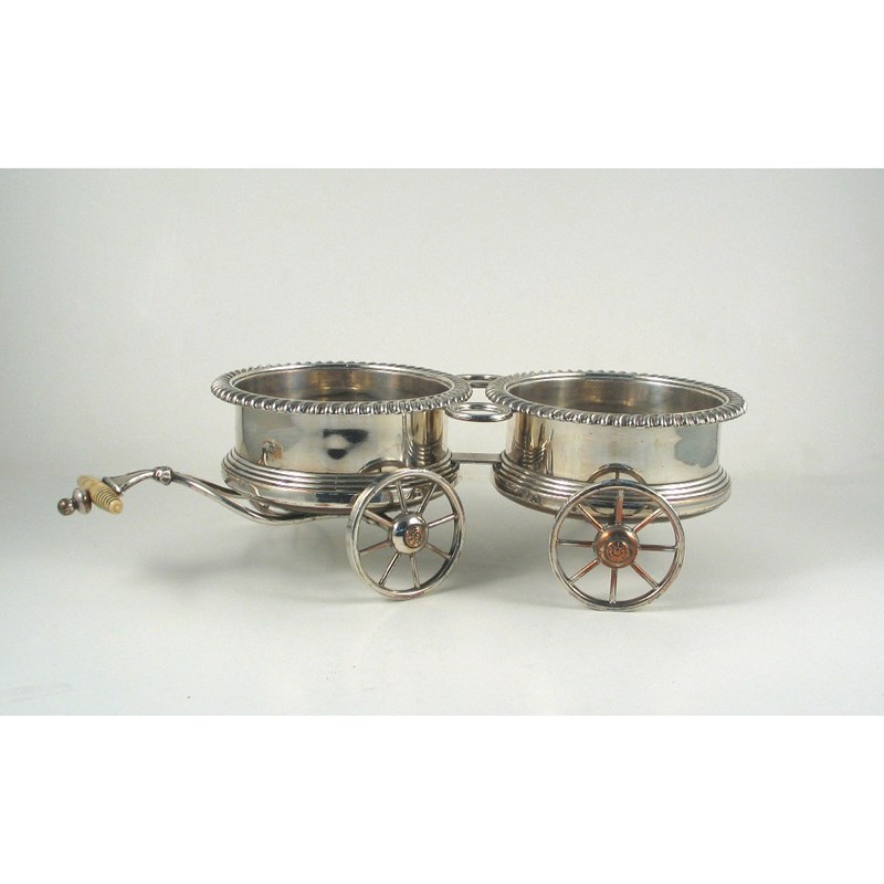 An Old Sheffield plated double coaster, with a turned ivory handle, spoked wheels and gadrooned coasters, with turned wooden bass and inset bosses, 16.75in, (42.5cm) long by S.C.Young and Co, c.1820.