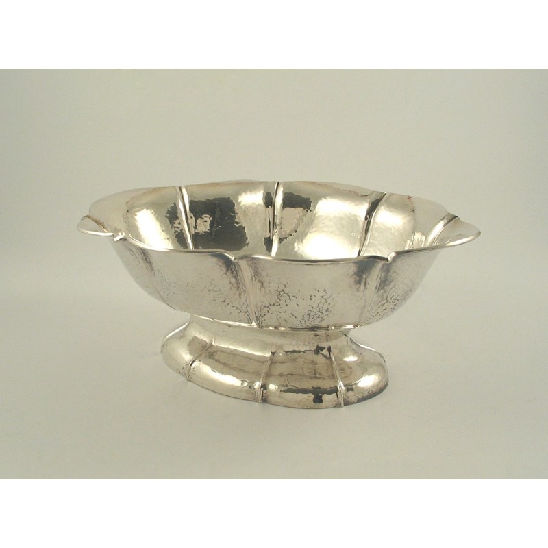 An early 20 th century German fruit dish, of shaped and lobed oval outline on a domed foot with a hammered finish, c.1900, 12.5in (32cm)wide, 19oz.
