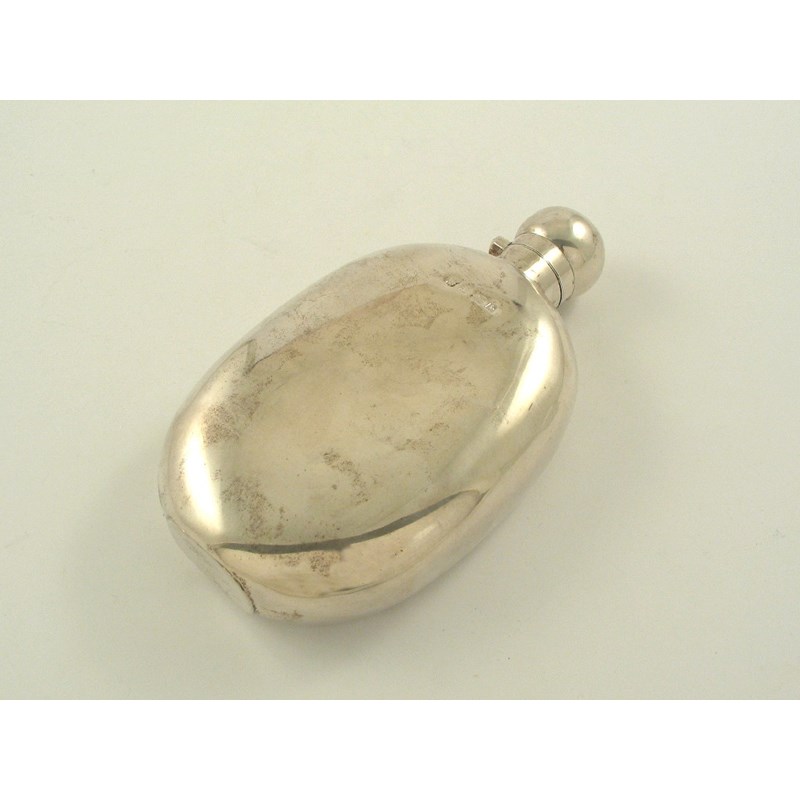 An Edwardian oval spirit flask, with a bulbons, hinged cover, by A & J. Zimmerman, Birmingham 1901, 7.3in (18.5cm)high, 8.75oz.