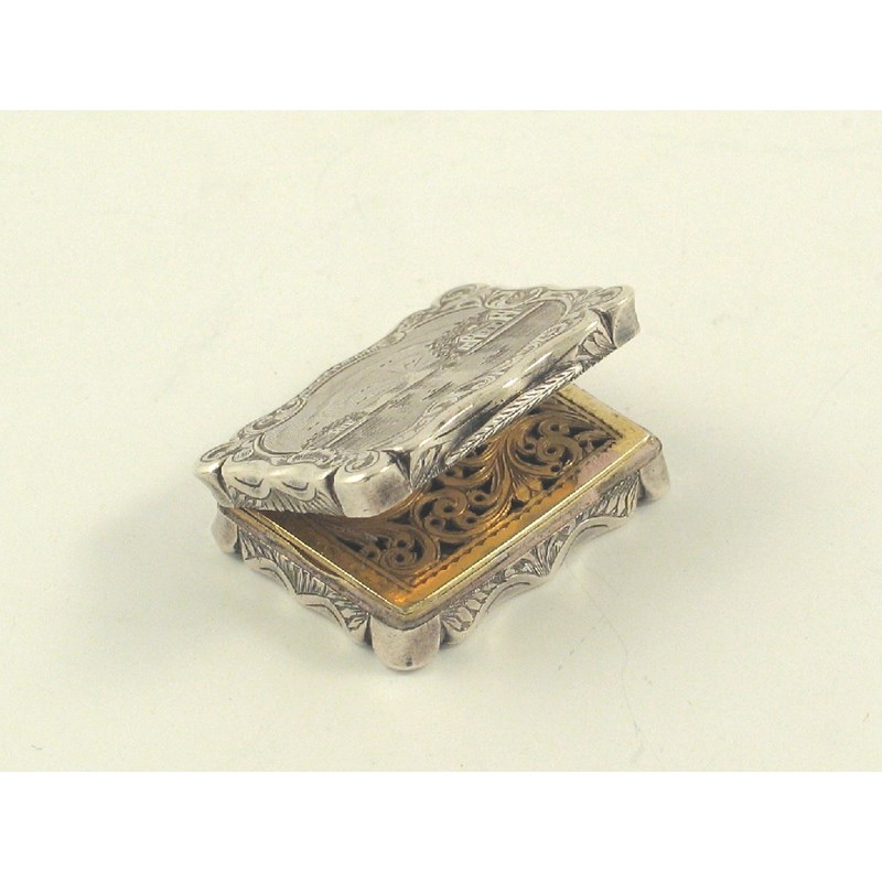 A Victorian vinaigrette,  of shaped oblong outline engraved on the cover, with buildings by a lake, against the setting sun, by E. Smith, Birmingham 1846, 1.65in (4cm)long.