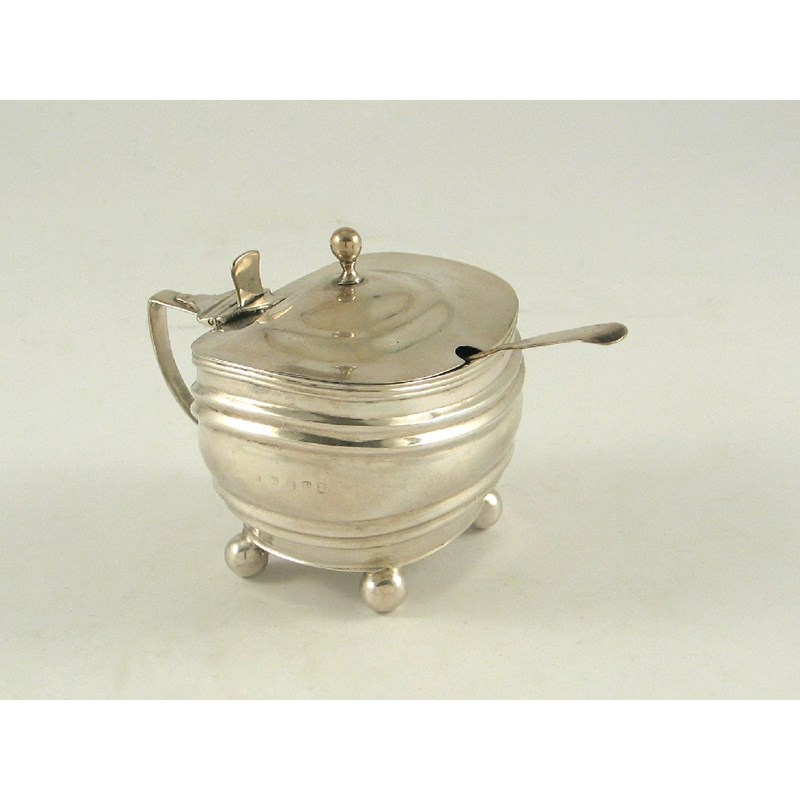 A George III mustard pot on ball feet, with a ball finial, makers mark worn, London 1810,m