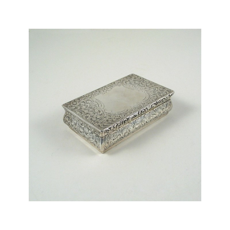 A Victorian large engraved snuff box, oblong, with bombe sides, a vacant shield cartouche on the cover and gilt interior by Thomas Dones, Birmingham 1853, 4in (10cm)wide, 5.25oz.