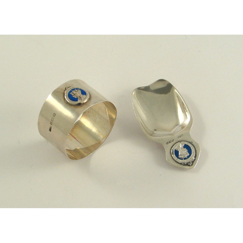 A commemorative George VI coronation caddy scoop and matching napkin ring, with enamelled portraits by W.H.Hasler, Birminham 1936, 1oz.(2)
