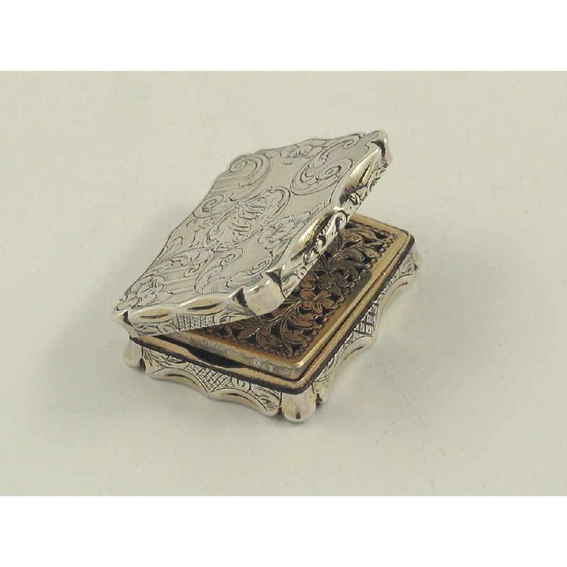 A Victorian vinaigrette, of shaped oblong outline, decorated with reserves of engine turning and engraved floral scrolls, by Nathaniel Mills, Birmingham, 1845, 1.6 inches (4cm) wide.