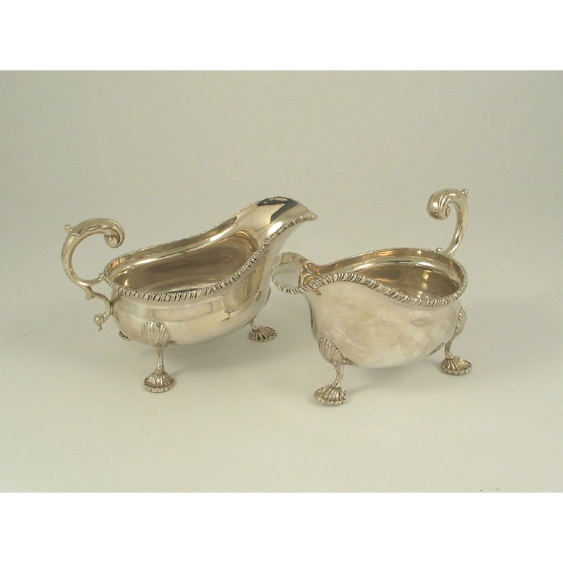 A pair of Edwardian sauceboats on three shell feet, with leaf capped, flying scroll handles and gadrooned borders by the Goldsmiths & Silversmiths Co Ltd, London, 1907, 6 inches (15.5cm) wide, 12oz, (2).