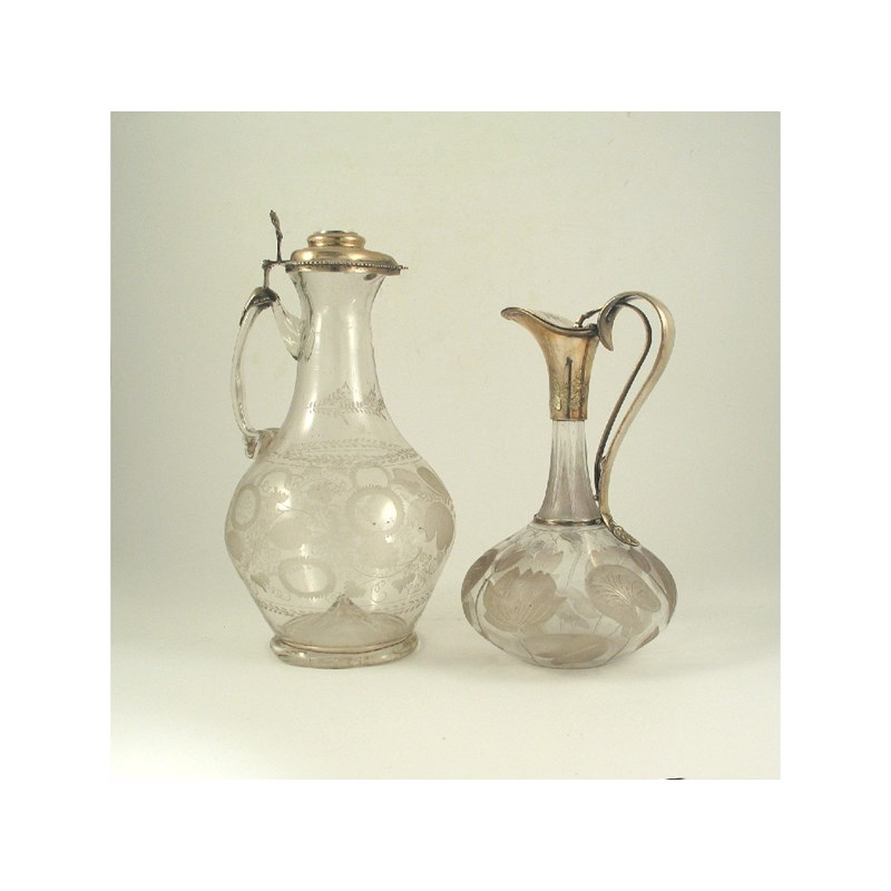 A continental mounted clear glass wine flagon, with wheel cut decoration (crack in base) and a Victorian plated mounted glass claret jug etched with lily flowers, the larger jug 12.5 inches (32cm) high, (2)