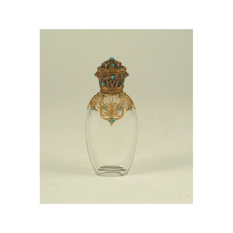 A Victorian silvergilt mounted clear glass scent bottle, with a hinged cover and pierced mantle, set with turquoise enamelled beads, glass stopper, unmarked, circa 1870, 4.45 inches (11.3cm) high.