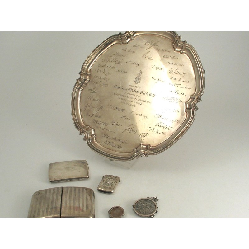 A modern salver, with a regimental inscription and facsimile, signatures 12in (30.5cm)diameter, a vesta case, two cigarette cases, a coin inset brooch and an 18th century Spanish 8 reals piece from the Hollandia - sink 1743, a pendant with chain (and accompanying article), 36oz. (6)