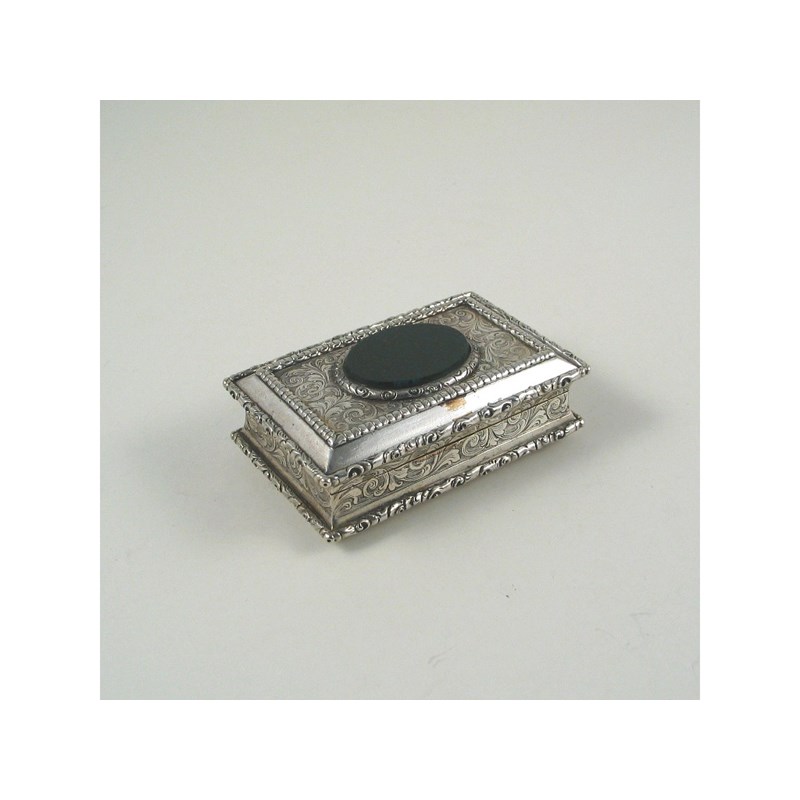 A Victorian oblong snuff box, with engraved decoration, raised floral borders and a bevelled cover, inset with an oval bloodstone panel, gilt interior, by Wheeler and Cronin, Birmingham 1843, 3.25in (8.2cm)wide, 4.5oz.