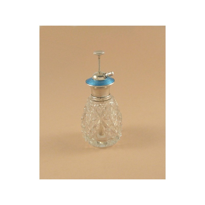 A modern mounted cut glass scent atomiser, with a blue enamelled cap and plated innards and plunger, by Adie Bros, Birmingham 1925. 5.75in (14.5cm) high, overall.