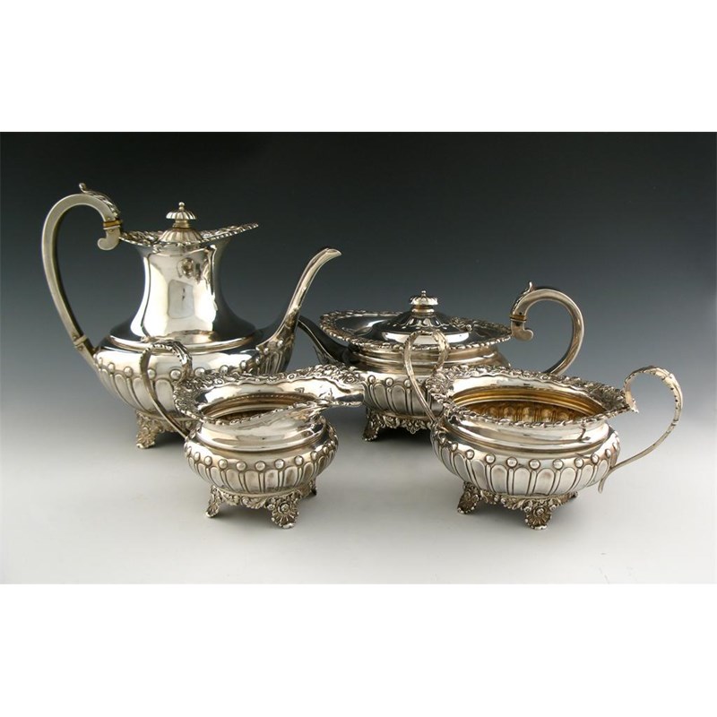 circular fluted form, leaf capped scroll handles, foliate scroll borders, on four bracket feet, approx. weight 76oz. (4)