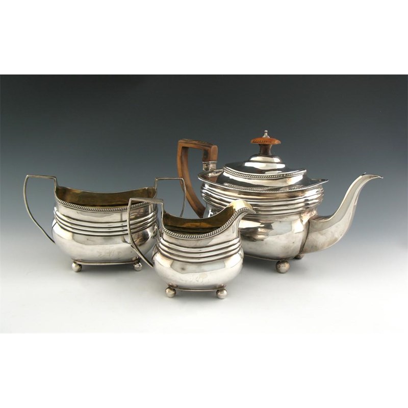 the teapot by Peter and William Bateman, London 1812, the cream jug and sugar bowl by Alice and George Burrows, 1807 and 1808,