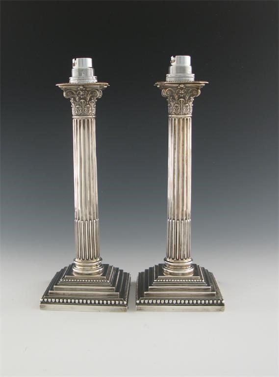 Corinthian column form, beaded borders on stepped square bases, drilled for electricity and with later light fittings, height 25.5cm. (2)