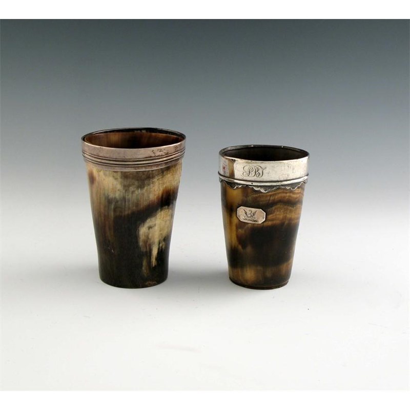 Two silver mounted horn beakers,