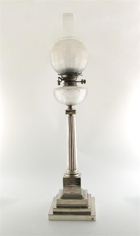 fluted Doric form column, on a raised rectangular plinth, engraved on two sides with a bow a target and a quiver of arrows, engraved with an armorial and inscribed ' Presented by the East Berks Archery Society to William Merry Esq their honourable secretary in gratitude for his services 1835', on a detachable stepped square old Sheffield plated base, with glass oil lamp fittings, height of column on base 49cm.