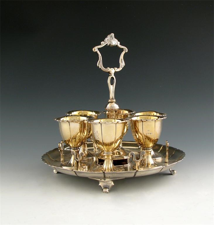 circular lobed form, central baluster and scroll handle, on four bracket feet, with six egg cups, engraved with a crest, height 21cm, approx. weight 30oz.