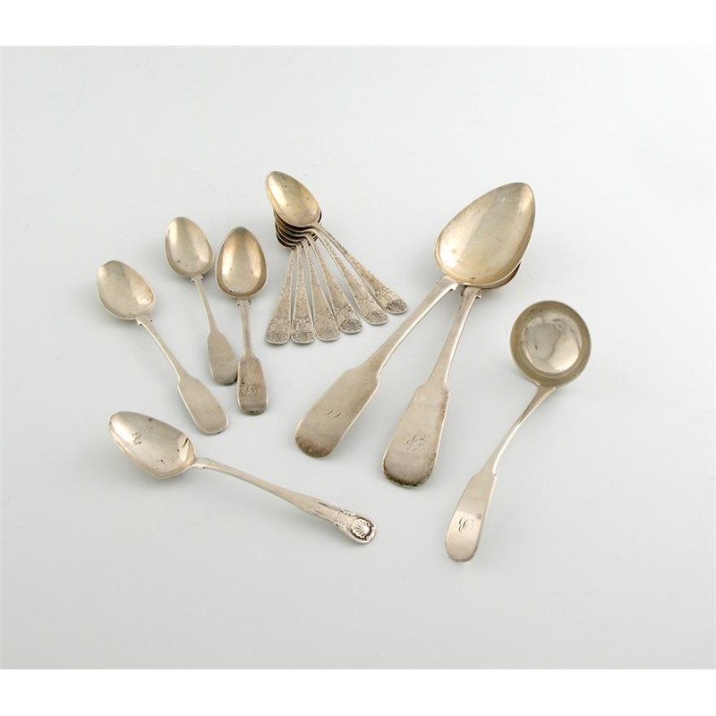 including a set of six engraved Hanovarian teaspoons, Glasgow 1889; two Fiddle pattern tablespoons; a Fiddle pattern teaspoon by Rettie and Son, three various teaspoons, a Fiddle pattern teaspoon (possibly St Andrews) and a George III toddy ladle.