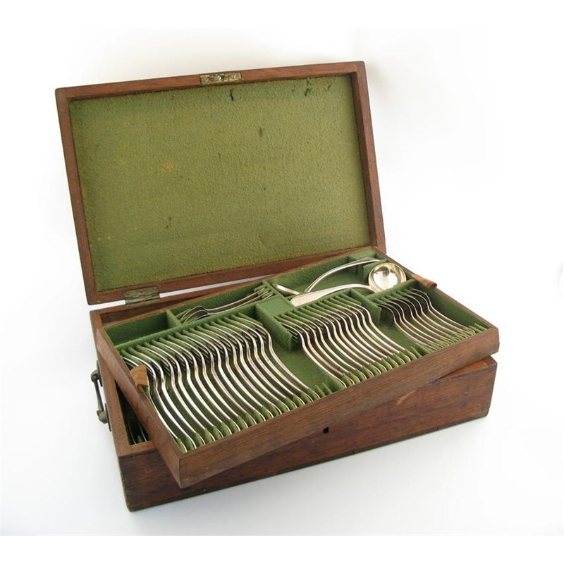 comprising: twenty four tablespoons, seventeen table forks, twelve dessert forks, twelve dessert spoons, eleven teaspoons, a soup ladle and a pair of sauce ladles, in a fitted wooden case, approx. weight 160oz.
