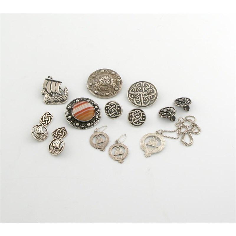 comprising: a silver mounted hard stone brooch and another circular brooch by Richard Allsion, with Edinburgh marks, a longboat brooch by Celtic Art of Iona, a Celtic brooch by I.M.C, plus a pendant an earrings, a pair of cufflinks and two further pairs of earrings. (13)