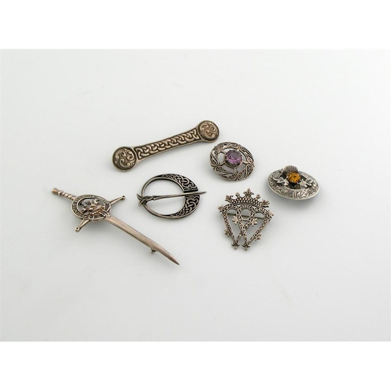 comprising four from Iona, including one with Celtic design, by I.HH, three by John Hart, and an Edinburgh dagger brooch and a Glasgow brooch set with a yellow thistle. (6)