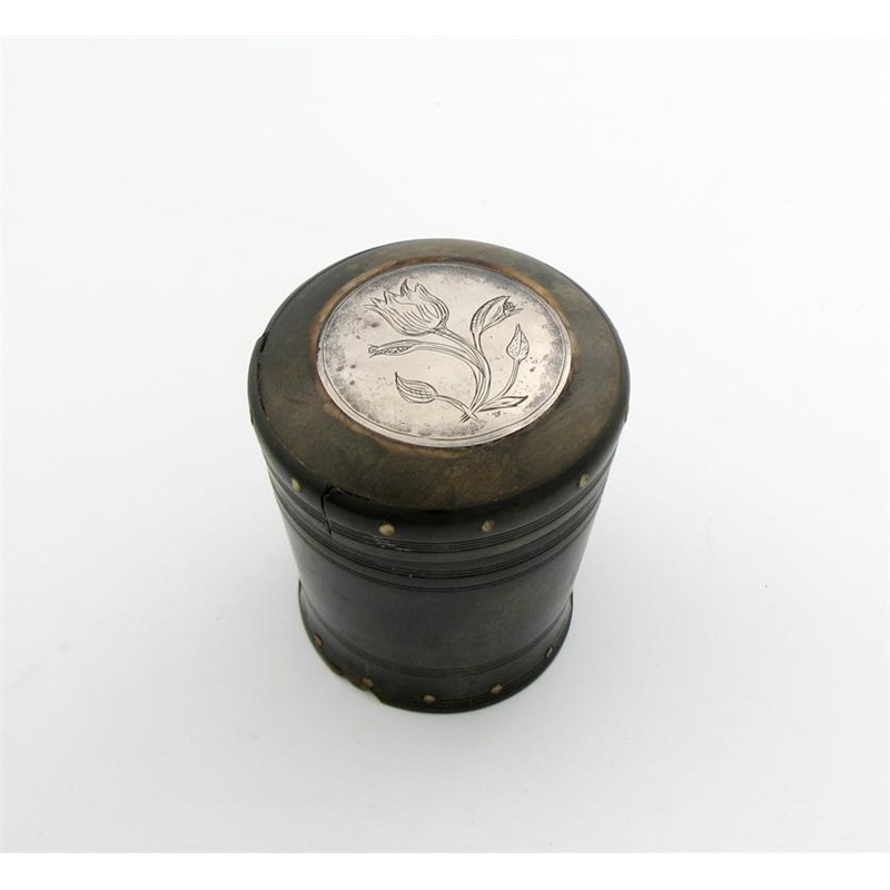 tapering circular form, the pull-off cover engraved with a tulip, the base and cover inlaid with a border of stud decoration, height 8.5cm