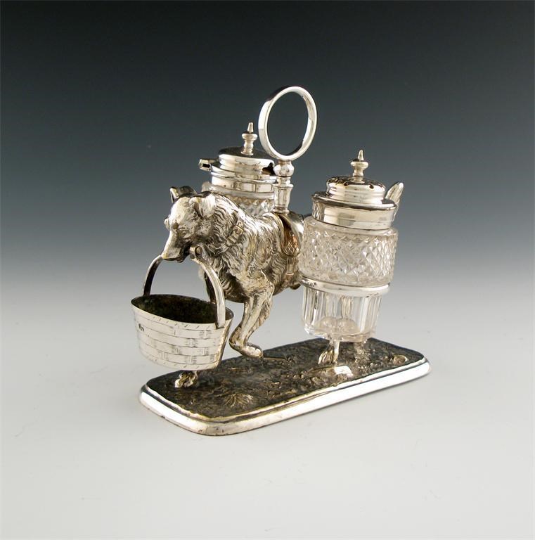 modelled as a standing dog holding a basket, with two panniers on his back with a glass mustard pot and pepper pot, with a central carrying handle, on a rectangular foot, length 13.5cm.