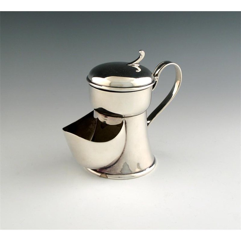 of waisted circular form, scroll handle, domed cover with a scroll thumb-piece, height 12.8cm.