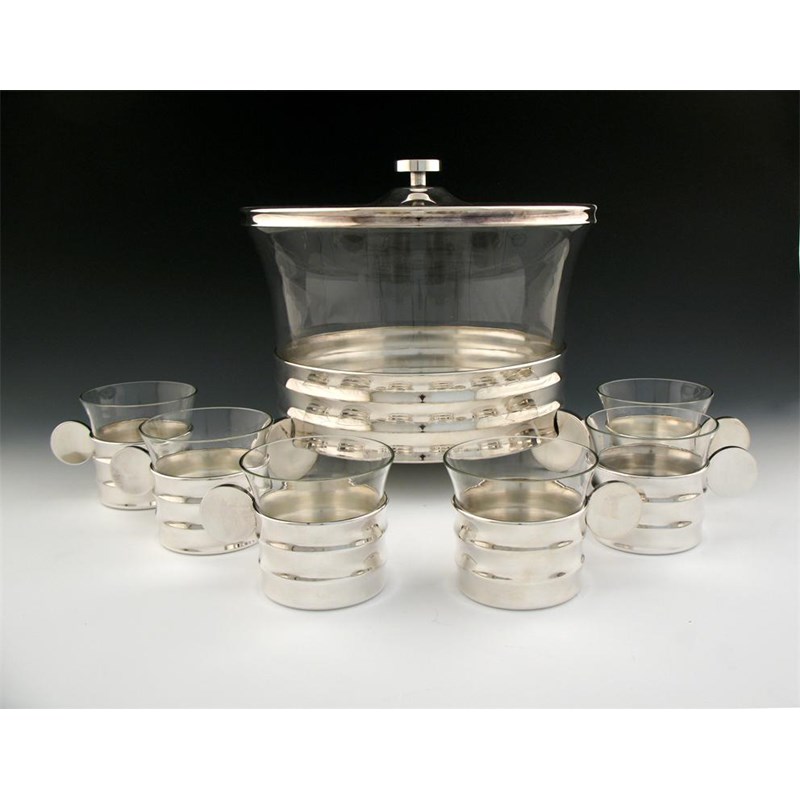 comprising a punch bowl with a pull-off cover, on three disc feet, and six punch cups, height of punch bowl 23cm.
