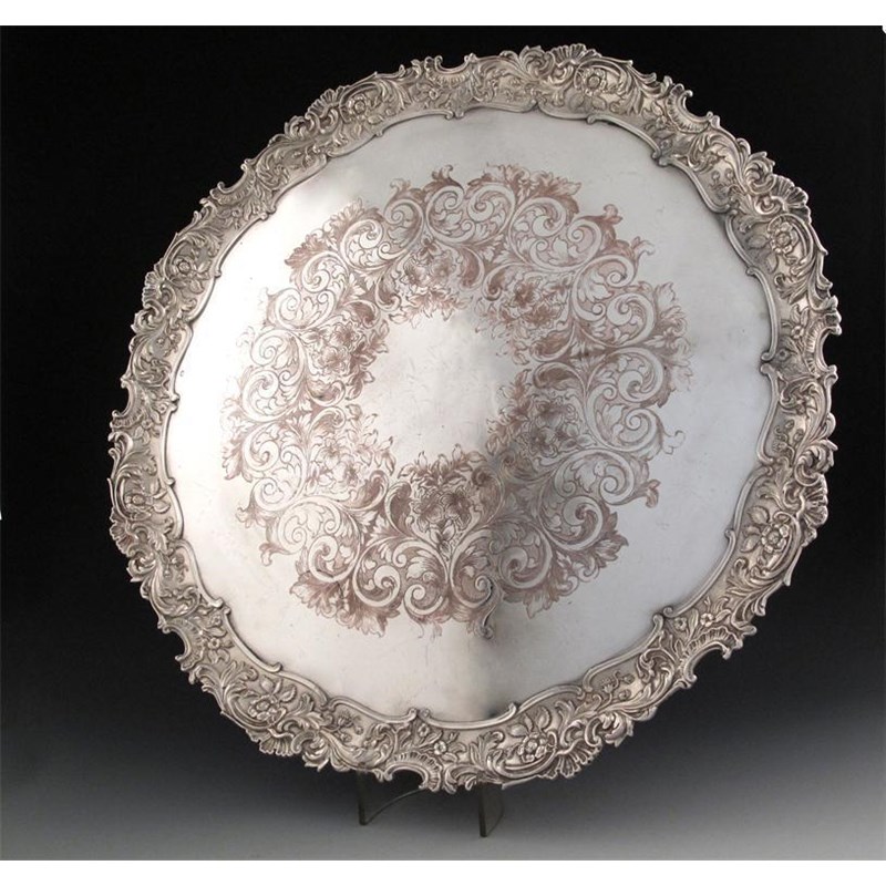 in the 18th century manner, circular form, engraved foliate decoration, foliate scroll border, on four bracket feet, diameter 60.5cm.