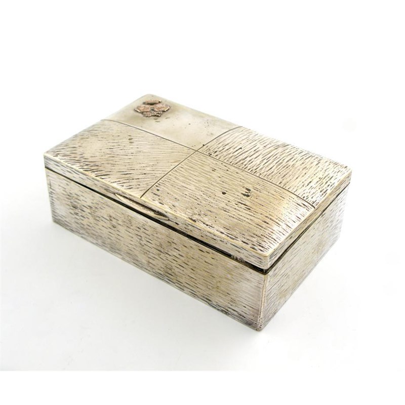 rectangular form, the hinged cover with alternate panels of textured and plain decoration, applied with two armorials and dated '29 Mai 1904', length 18.8cm.