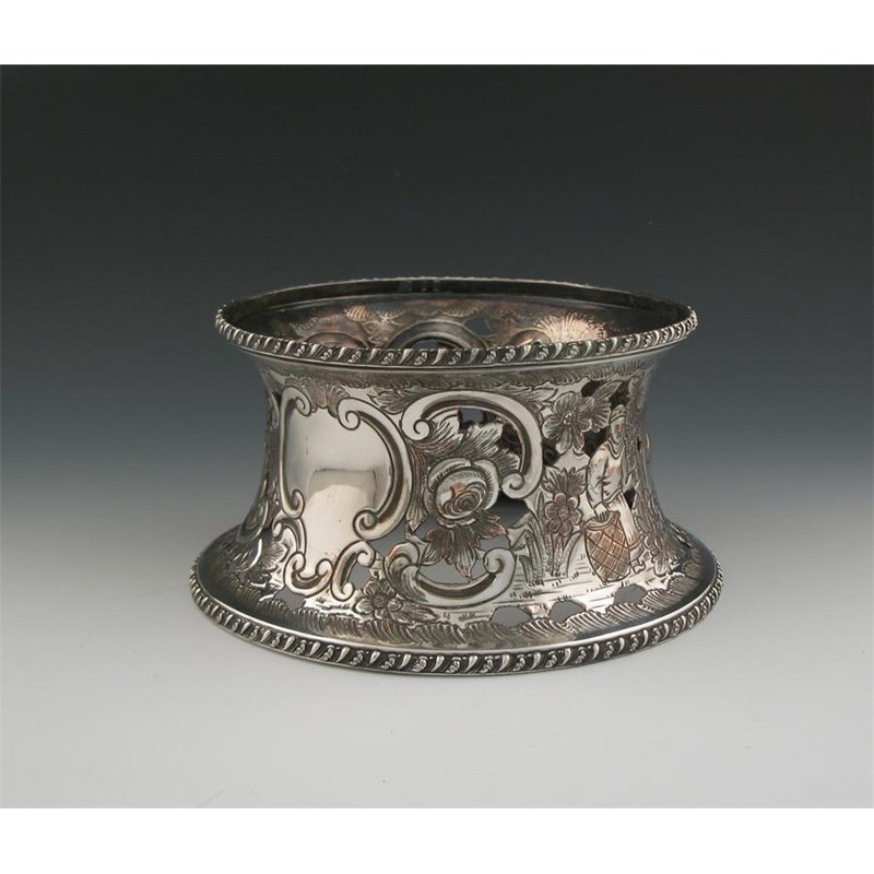 circular form, embossed and pierced with figures in foliate landscapes with birds, gadroon borders, diameter of base 21cm.