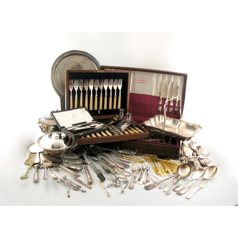 comprising: a caviar dish, a swing-handled basket, a pair of modern candlesticks, a cased set of eleven fish forks and twelve fish knives, an American part canteen in a wooden case, plus a quantity of flatware. (qty)