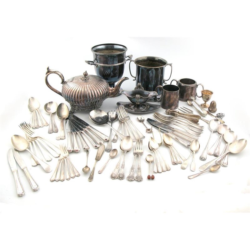 comprising: silver items; an acorn shaped pepper pot, an egg cup, a commemorative spoon, and a Norwegian brooch , electroplated items a two handled vase, a siphon stand, a fluted teapot and a quantity of flatware. (qty)